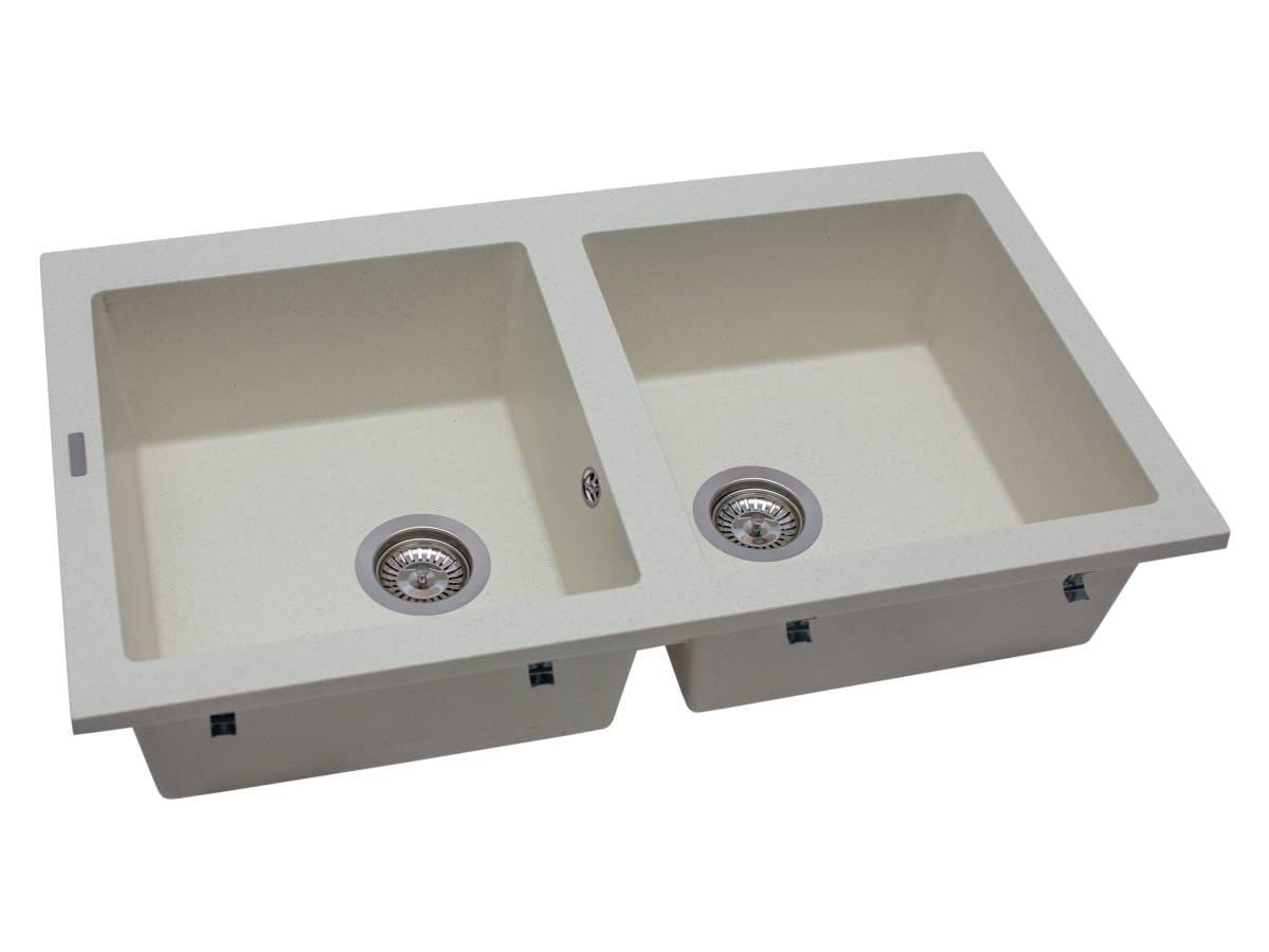 Прямокутна кухонна мийка із кварцового піску WESTEROS кольору жасмін стане незамінним помічником на вашій кухні! Дві прямокутні однакові чаші - це зручно, можна частину посуду замочити, а в цей час вимити решту посуду в основній чаші. Тарілки і чашки не будуть бруднитися від жирного посуду, а деко швидше відмиється від забруднень, що економить час, воду і миючий засіб. Мийка має врізний тип монтажу.